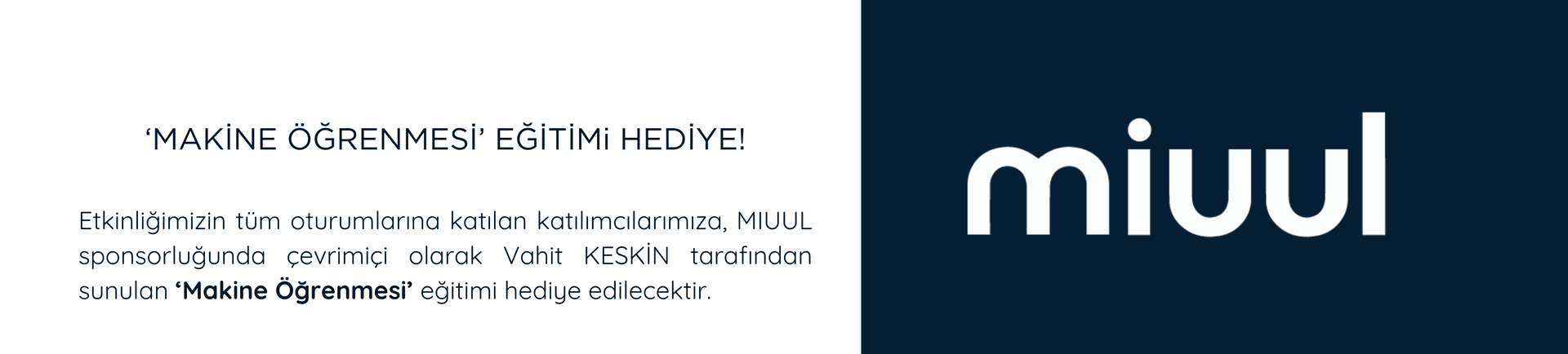 Tüm oturumlara katılanlara, MIUUL sponsorluğunda Vahit KESKİN tarafından çevrimiçi sunulan, $149 değerindeki Makine Öğrenmesi eğitimi hediye edilecektir!